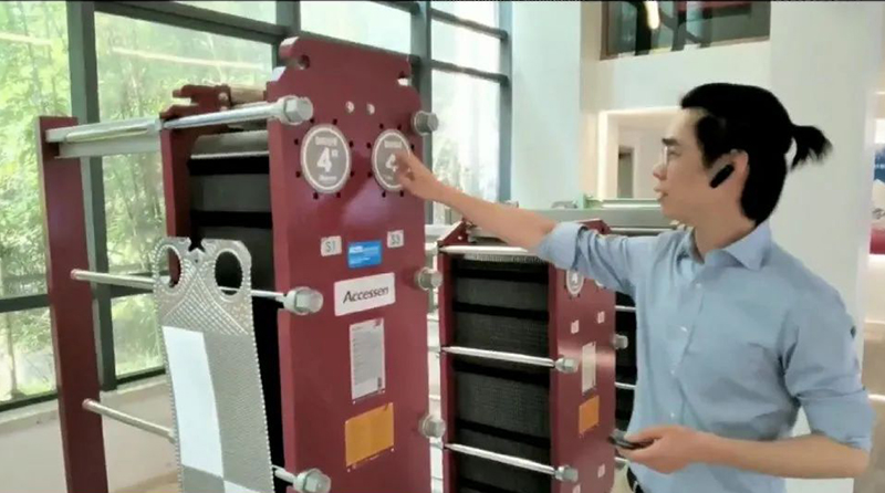 直播重點詳細(xì)介紹了AHRI認(rèn)證板式換熱器的設(shè)計原理和應(yīng)用場合,以及艾克森的換熱器產(chǎn)品設(shè)計特點,接口銹鋼的襯套,滿足了過流部件均為不銹鋼,避免水質(zhì)污染,相比橡膠襯套而言使用壽命更長;考慮到日后的維護(hù)需求,螺紋保護(hù)套采用不銹鋼的,能滿足更長時間的使用,產(chǎn)品的板片設(shè)計等技術(shù)核心;整個參觀過程中通過宣傳片和視頻,展示了太倉工廠的生產(chǎn)設(shè)備和加工生產(chǎn)過程。